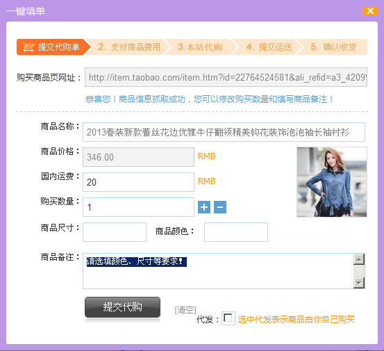 當您在國內(nèi)購物網站(zhàn)選好要買的商品後,隻需将商品網址鏈接粘帖到易購中國網頁右上(shàng)角的“一鍵代購”,系統就會(huì)自動抓取商品信息:如商品名稱,價格, 商家(jiā)運費,以及商品顔色尺碼等。